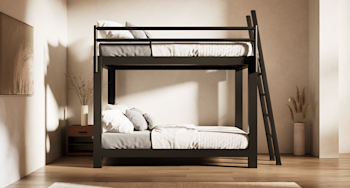 The star of the Happy Roadrunner’s sleeping accommodations is a Queen Over Queen Adult Bunk Bed, turning the converted office space into a spacious bunk room. When faced with the design conundrum of making a comfortable guest bedroom out of a smaller space, the Porter team found a solution with Adult Bunk Beds. “We chose this bunk bed to fit into the tight space after retrofitting a custom window surrounding a desk that overlooks the beautiful backyard,” says Porter representative Juli Voloch. “The trim finishes of the bunk bed match the custom desk perfectly as if they were all designed and built together.” It’s a nod to the incredible design versatility of these larger-than-life bunk beds.