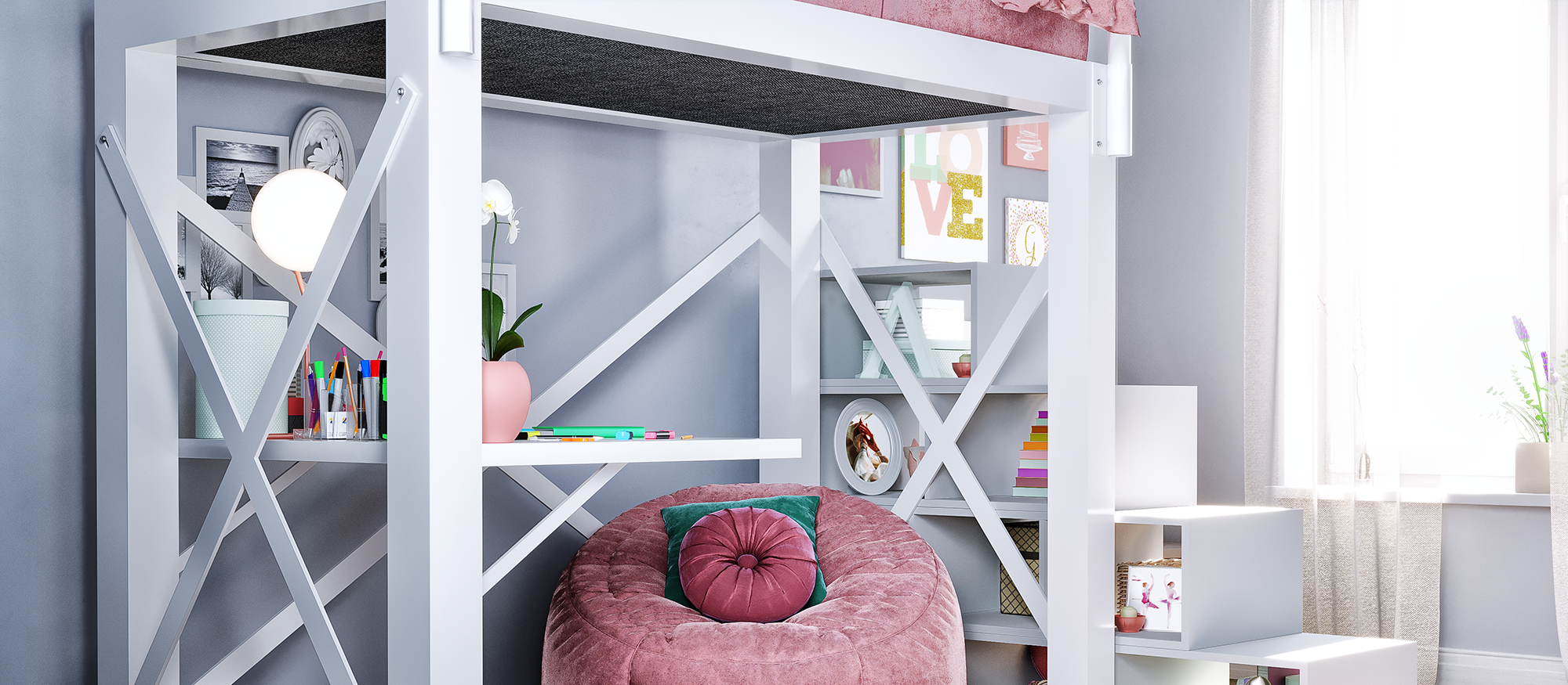 Customize the perfect loft bed for your space. Choose from five vibrant and sophisticated finishes to match your decor. Select the number of guard rails and ideal size for your room’s ceiling height. Get a ladder or a loft bed with stairs when you choose your preferred access option.