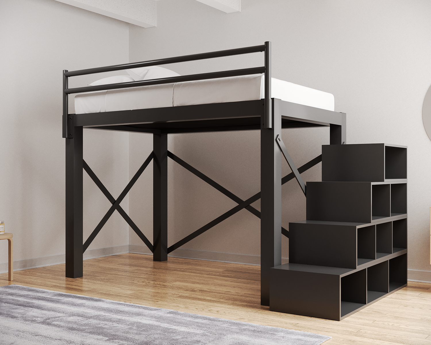 • Our Full XL Loft Beds do not automatically ship with a mattress, but any commercially available extra long full size innerspring mattress will fit the bed frame. We recommend a mattress with a thickness of 8-12 inches. Our loft beds do not require a box spring, but for memory foam mattresses, we do recommend using a piece of wood to create a flat service or adding extra slats. We can include a 1/8” thick masonite board with your order for $95 or additional slats for $95. Please request these options in the Special Instructions section during checkout.